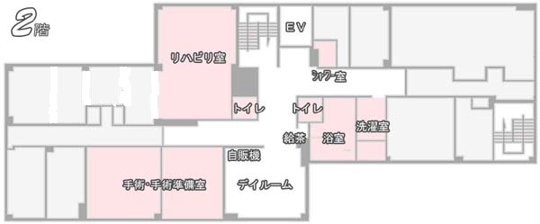 2階はリハビリテーション室と洗濯室、入浴施設、厨房、手術室などがあります。 |